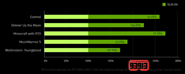 NVIDIA官方給出了一組對比數(shù)據(jù):RTX 3080在4K分辨率下,開啟DLSS后,游戲性能最少可以提升80%左右,最多則可提升170%!
