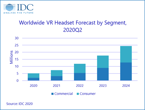 “雖然游戲仍然是消費者VR的前沿,但其他用例,如虛擬音樂會和虛擬鍛煉也開始引起買家的共鳴。同時,許多企業(yè)繼續(xù)加大對VR的使用力度,培訓(xùn)、協(xié)作、設(shè)計和制造用例推動了這一勢頭。我們預(yù)計商業(yè)領(lǐng)域?qū)?020年占全球市場的38%增長到2024年的53%。”