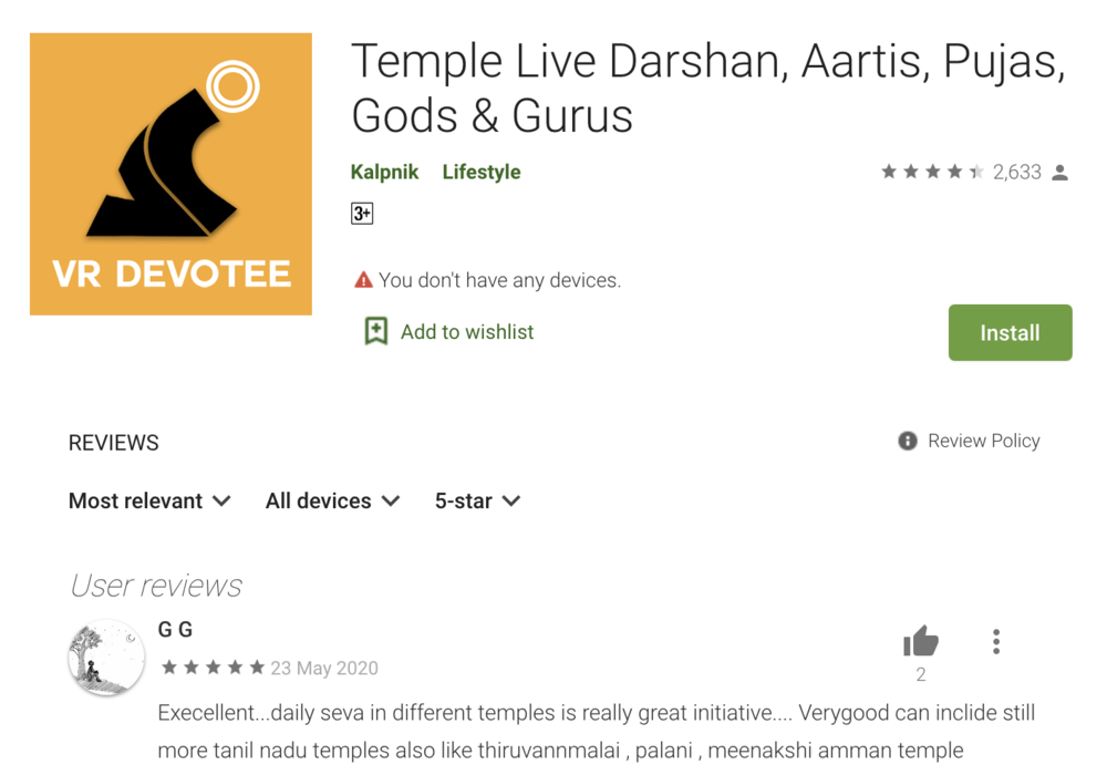 來自印度南部的老哥 Jayakumar·Vilvaraj 疫情宅家的時(shí)候,抱著試試看的心態(tài)用了一用這個(gè)App,打算給自己生病的小狗狗祈福。他本以為這只是資本的把戲,但在用過之后,只是用顫抖的手擦擦了眼角的淚,平撫心情留下五星點(diǎn)評。