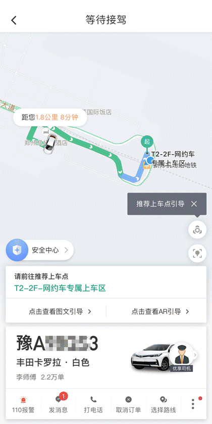 當(dāng)乘客在支持AR導(dǎo)航的場站,使用滴滴出行App選擇推薦上車點發(fā)單成功后,可以通過產(chǎn)品界面中的AR按鈕進(jìn)入導(dǎo)航界面,并按指引操作,體驗在AR元素指引下到達(dá)上車點。如下圖所示。