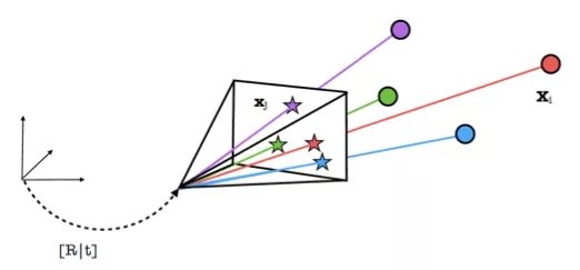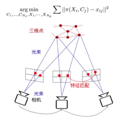 首先我們了解下SfM的技術(shù)框架,一共四個主要步驟:①數(shù)據(jù)采集;②特征提取;③數(shù)據(jù)關(guān)聯(lián);④結(jié)構(gòu)恢復(fù)。在恢復(fù)場景的三維結(jié)構(gòu)時,并不是使用圖像中的所有像素點,而僅從圖像中提取穩(wěn)定、顯著的點,也就是特征點;數(shù)據(jù)關(guān)聯(lián)是確定有共視區(qū)域的兩張圖像中哪些特征點是對應(yīng)的;后續(xù)會借助幾何的方法以及最優(yōu)化技術(shù)(Bundle Adjustment)將這些圖像中的點恢復(fù)為空間的三維點。整個問題最終被轉(zhuǎn)化為大型非線性最優(yōu)化問題求解,優(yōu)化目標(biāo)是重建的三維點重投影到圖像中的位置與圖像中的觀測點位置差最小,也就是最小化重投影誤差。