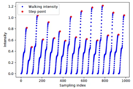 下圖展示了真實行走狀態(tài)下步態(tài)強度的變化情況,其中藍(lán)色點表示步態(tài)強度,紅色點表示步點。