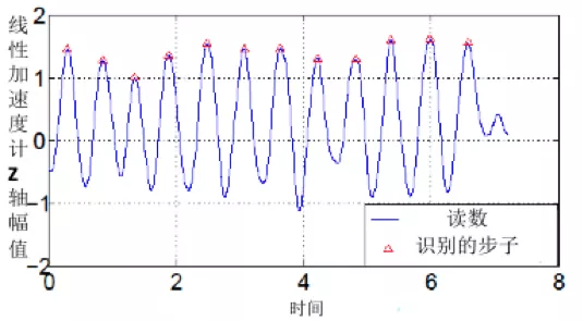 計步算法示意圖如下圖所示,其中藍(lán)色曲線表示加速度計讀數(shù),紅色三角形表示識別到一步。