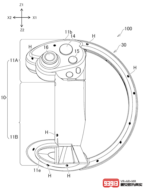 根據(jù)專利文件中的示意圖,新控制器設(shè)有多個發(fā)光源(下圖H), 通過頭戴式顯示器上的攝像頭偵測光源,再將信息傳送到游戲主機(jī)。除此之外,專利文件中還提到控制器內(nèi)建加速感測器、陀螺儀等,也是為了能獲得更精確的控制器的相對位置。