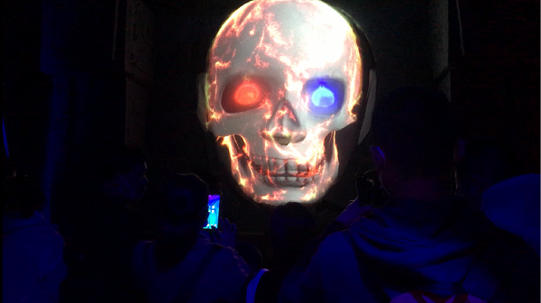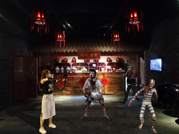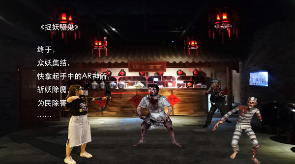 游客只要佩戴am glass眼鏡,在園區(qū)內(nèi),就可以化身“捉妖師”。陰森悠長的通道,驚悚的音樂,晦暗的燈光,骷髏,喪尸等妖族被捉妖符鎮(zhèn)壓,游客在亦真亦假的迷幻世界中,不但可以與“小倩”近距離接觸,還可以拿起手中的弓箭進行AR捉妖。