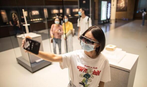 一位年輕的游客正戴著AR眼鏡與玉琮自拍。從外觀上看,這幅智能眼鏡的大小跟普通墨鏡差不多,可以折疊并能輕松佩戴。從內(nèi)部來看,它搭載了AR智慧導(dǎo)覽應(yīng)用,能夠?yàn)橛慰蛶鞟R特效、數(shù)字沙盤、AR地圖導(dǎo)覽、虛擬導(dǎo)游等虛實(shí)結(jié)合的功能體驗(yàn)。