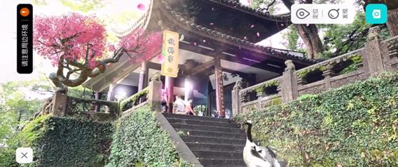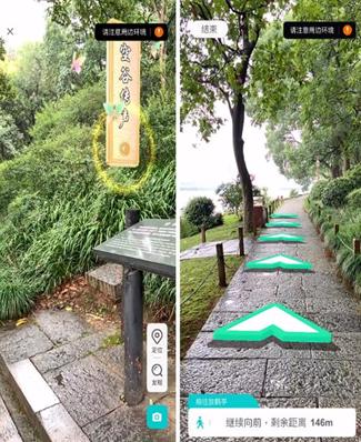 當(dāng)游客身處這條線路時(shí),打開手機(jī)APP“掌上西湖”,對著實(shí)景掃一掃,就可以開啟AR導(dǎo)航導(dǎo)覽模式,一覽周圍景色特點(diǎn),還可以聽到愜意的背景音樂。