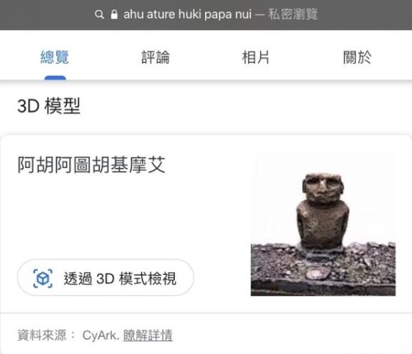 在Google搜索結(jié)果頁中找到“3D模型”結(jié)果,點擊“通過3D模式查看”即可。需要注意的是,如要召喚出摩艾石像,請搜索“ahu ature huki papa nui”