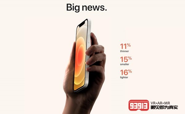 全新的鋁金屬邊框設(shè)計(jì)讓iPhone 12相比iPhone 11薄了11%,尺寸上更加緊湊,體積縮小了15%,同時(shí)重量也減輕了16%。