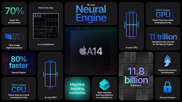 iPhone 12搭載了蘋果最新的A14仿生芯片5nm制程芯片,也是全球首款5nm制程的芯片,擁有6核CPU與4核GPU,性能相比其他手機(jī)芯片超出50%。A14仿生的晶體管數(shù)量為118億,比A13超出近40%,同時(shí)在晶體管的體積、性能和能耗上都比A13有所提升。A14仿生芯片還擁有更強(qiáng)大的AI能力,ML加速器相比上代的A13提升達(dá)到70%;Neural Engine從8核心增加到了16核心,性能提升達(dá)到80%,每秒可以進(jìn)行11萬億次操作。