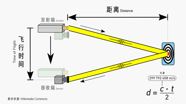 在這塊圓形黑色區(qū)域之下,LiDAR主要由兩部分組成:發(fā)射端和接收端。垂直腔面發(fā)射激光器(VCSEL)作為發(fā)射端,向物體發(fā)射一束紅外光,經(jīng)反射被 CMOS 圖像傳感器接收,光束經(jīng)歷的這一段時間被稱為飛行時間(ToF)。