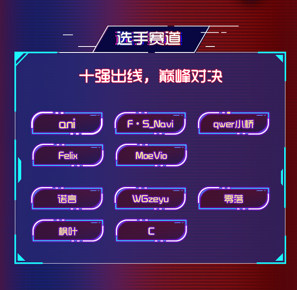 本次一路晉級全國總決賽的十強選手不乏世界排名前列的“節(jié)奏大神”,也有從初賽,復(fù)賽一路過關(guān)斬將的律動黑馬,他們分別是:ani、F·S_Navi、qwer小橋、Felix、MoeVio、諾言、WGzeyu、零落、楓葉和C。群雄匯聚,各領(lǐng)風(fēng)騷,總決賽的強強對決將是他們展示自己最強節(jié)奏的最佳舞臺,這場世界級的較量,究竟是高手的穩(wěn)中求勝還是黑馬的驚艷出線呢?