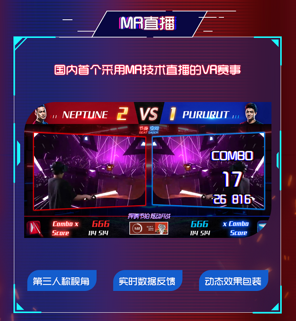 作為《節(jié)奏空間》全國首個VR電競挑戰(zhàn)賽,高質(zhì)量的觀賽體驗無疑是最重要的一環(huán)。本次全國總決賽的線上直播中將加入MR技術(shù),這將是國內(nèi)首個采用MR技術(shù)直播的VR賽事。為了給予線上線下觀眾們最佳的觀賽體驗,本次總決賽將采用MR技術(shù)進(jìn)行線上線下同步直播,這一技術(shù)可以將虛擬與現(xiàn)實完美融合,并通過實時數(shù)據(jù)反饋、動態(tài)粒子效果等方式,讓觀眾們得以更直觀的感受到強烈的效果沖擊和選手們的超高技巧! 屆時,不僅線下的觀眾玩家們能獲得極佳的觀賽效果,線上觀賽的玩家們同樣可以獲得親臨現(xiàn)場般的沉浸式體驗。