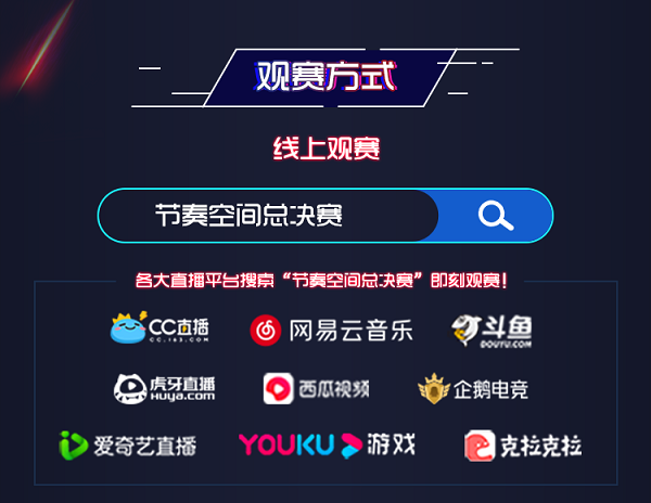 線上觀賽的小伙伴屆時可通過CC直播、LOOK直播、B站、斗魚、虎牙、西瓜、愛奇藝、優(yōu)酷、克拉克拉等直播平臺搜索“節(jié)奏空間總決賽”即可收看總決賽的巔峰對決!