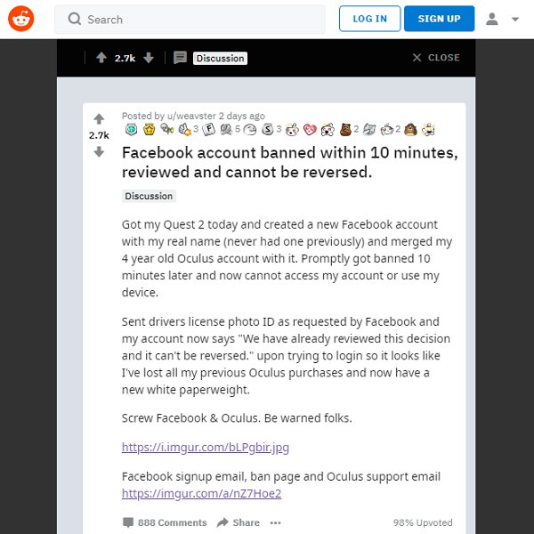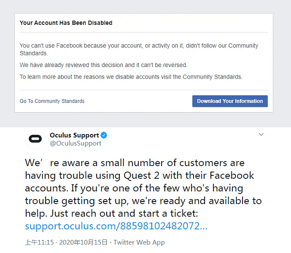 除了Twitter,Reddit上也有許多Oculus 2用戶發(fā)帖抱怨賬號(hào)躺槍。背后原因是,Quest 2是首款需要通過(guò)Facebook賬號(hào)來(lái)登錄(而非單獨(dú)的 Oculus 賬號(hào))的Oculus 設(shè)備。