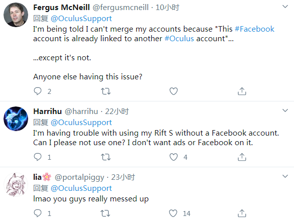 Oculus 官方支持賬號(hào)下匯集了許多用戶的報(bào)告,看似問(wèn)題出在當(dāng)前的 Oculus 賬號(hào)與 Facebook 賬號(hào)的合并上。