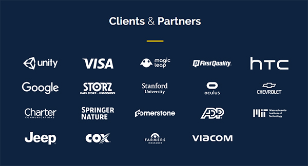Talespin成立于2015年,其客戶和合作伙伴包括雪佛蘭、Magic Leap、谷歌、HTC、Viacom、Oculus、斯坦福大學、JEEP、VISA等。在今年的3月份,Talespin宣布完成由云教育軟件供應(yīng)商Cornerstone OnDemand領(lǐng)投,HTC、Farmers Insurance Exchange跟投的1500萬美元B輪融資,總?cè)谫Y金額達到2000萬美元。