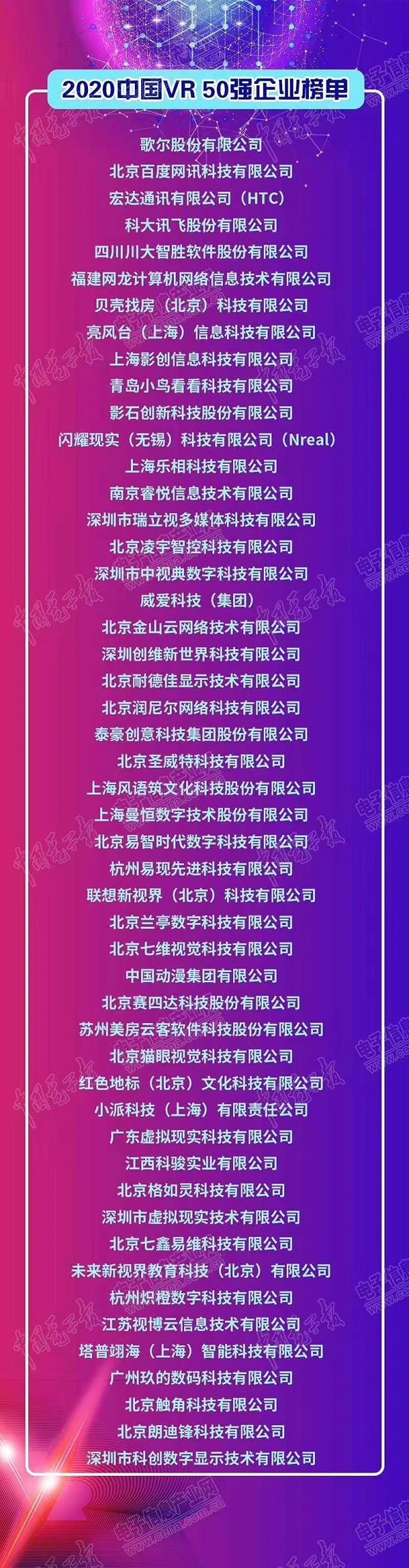 在10月19日上午舉辦的2020世界VR產(chǎn)業(yè)大會(huì)主旨演講環(huán)節(jié)最后,中國(guó)工程院院士、虛擬現(xiàn)實(shí)技術(shù)與系統(tǒng)國(guó)家重點(diǎn)實(shí)驗(yàn)室主任趙沁平代表組委會(huì)公布了本次“中國(guó)VR 50強(qiáng)”企業(yè)名單,入選企業(yè)如下: