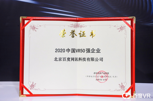 百度在大會上被評為“2020中國VR50強企業(yè)”