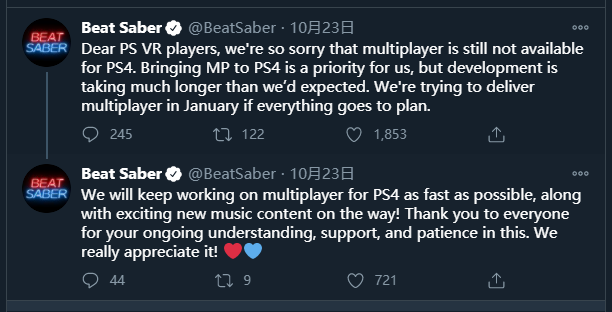 在推文中,Beat Games表示,“將多人模式移植到PSVR上是我們當(dāng)前的首要任務(wù),但開發(fā)所需要的時間比我們的預(yù)期要長得多。如果一切按計劃進(jìn)行,我們將在1月份發(fā)布PSVR版本的多人游戲模式。”