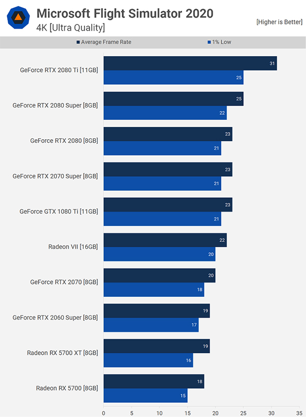 作為今年最受期待的大作之一,「微軟模擬飛行」不僅視覺效果上令人嘆為觀止,技術(shù)層面也相當(dāng)領(lǐng)先 ,但同時(shí)也對(duì)PC 硬件提出了相當(dāng)高的要求。根據(jù)TechSpot分享的基準(zhǔn)測試數(shù)據(jù),在4K分辨率、極致畫質(zhì)(Ultra Quality)下,即便上一代“卡皇”RTX 2080Ti的平均幀數(shù)也不過是可憐的31FPS……慶幸的是,伴隨著NVIDIA RTX30系列和AMD RX6000系列顯卡的推出,GPU性能又提升了一大截。