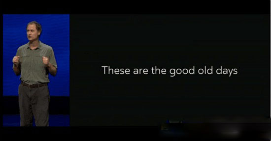 演講最后阿布拉什說,“也許在場(chǎng)的你們,數(shù)年后,處于VR普及的時(shí)代時(shí),間或會(huì)回憶起此時(shí)此刻,從而發(fā)出‘哇喔,我當(dāng)時(shí)就在Oculus Connect’會(huì)場(chǎng),是我見證了VR的歷史。”就像我們回憶起計(jì)算機(jī)等高科技的最初發(fā)展?fàn)顟B(tài)那樣,也許現(xiàn)在我們難以相信,但數(shù)年后我們會(huì)感覺到,現(xiàn)在,VR這些充滿了挑戰(zhàn)的日子,就是最美好的舊時(shí)光。