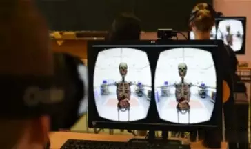 這是一節(jié)生物虛擬解剖課。通過(guò)虛擬現(xiàn)實(shí)頭盔,學(xué)生們進(jìn)入了一個(gè)虛擬教室,里面有一個(gè)包含骨頭和其他器官的骨架模型。學(xué)生進(jìn)入這個(gè)世界后就可以隨意用手控制模型里部件。體感控制器能捕捉紅外線,追蹤你的手部動(dòng)作并轉(zhuǎn)化成程序里的指令。比如,握緊拳頭能拖動(dòng)周?chē)氖澜纾ɑ蛘哒f(shuō)是你在虛擬世界里的位置)。果斷地指向一個(gè)物體能“選擇”,并且把它放到你虛擬手臂的位置,使你能在虛擬世界里控制它。