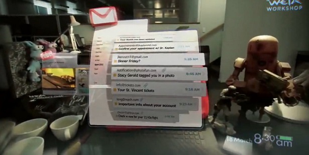 Magic Leap 引起關(guān)注是因?yàn)槿ツ旯雀桀I(lǐng)投的 5 億美元融資。這家公司之后一直非常低調(diào),在今年三月份 Magic Leap 放出了一段演示視頻后,終于在 7 月份曝光了一份名為“頭戴組件”系統(tǒng)(如下圖)。該系統(tǒng)會(huì)檢測(cè)出用戶所在的(移動(dòng))位置并將數(shù)據(jù)上傳到云端,之后讓用戶所處的環(huán)境對(duì)接其 3D 光塑技術(shù)(光線)在現(xiàn)實(shí)中塑造的虛擬圖象。