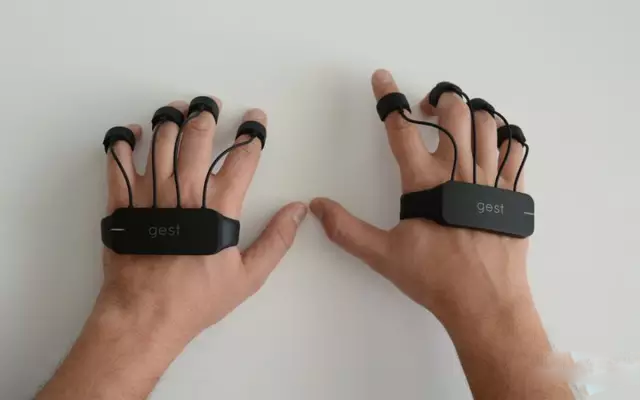Gest 由一個(gè)像運(yùn)動(dòng)手環(huán)的主體和四根指環(huán)組成,每個(gè)指環(huán)通過線材和主機(jī)連接。主機(jī)上包含了手套控制器、陀螺儀和其他的傳感器。它是通過藍(lán)牙與你的手機(jī)或者電腦進(jìn)行連接,而內(nèi)置的電池也能夠支持它一天的工作。