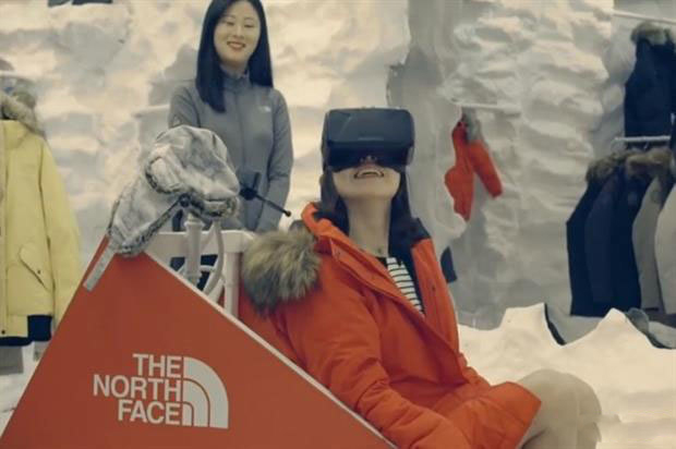 在韓國的一個(gè)購物中心,全球戶外運(yùn)動領(lǐng)導(dǎo)品牌樂斯菲斯(The North Face)專賣店邀請顧客戴上虛擬現(xiàn)實(shí)頭顯Oculus Rift體驗(yàn)?zāi)蠘O的冰天雪地。