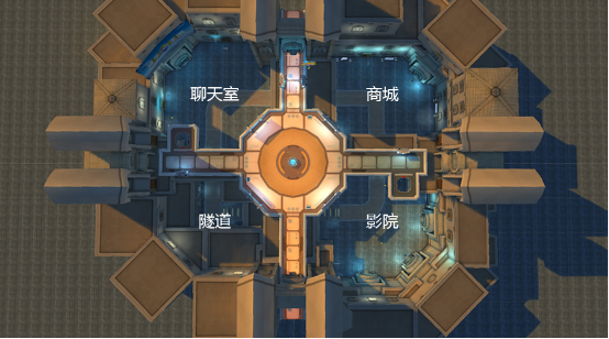 主城分為上下兩層,電梯分布在西北區(qū)和東南區(qū),連通上下。上層主要是游戲娛樂(lè)區(qū):躲貓貓、撕名牌、嘉年華以及通往其他廣場(chǎng)的全息臺(tái)。下層主要是社交體驗(yàn)區(qū):聊天室、商城、多個(gè)院線以及活動(dòng)任務(wù)的NPC。