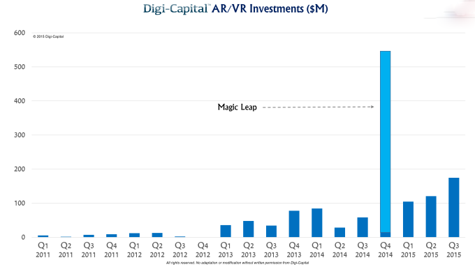 從2006到2014年底,對(duì)于增強(qiáng)/虛擬現(xiàn)實(shí)的投資都是在緩慢進(jìn)行。之后Magic Leap從谷歌及其他投資方處獲得的5.42億美元投資成為投資加速的發(fā)令槍?zhuān)谶^(guò)去的12個(gè)月里吸納將近10億美元的資本投入到這個(gè)行業(yè)。