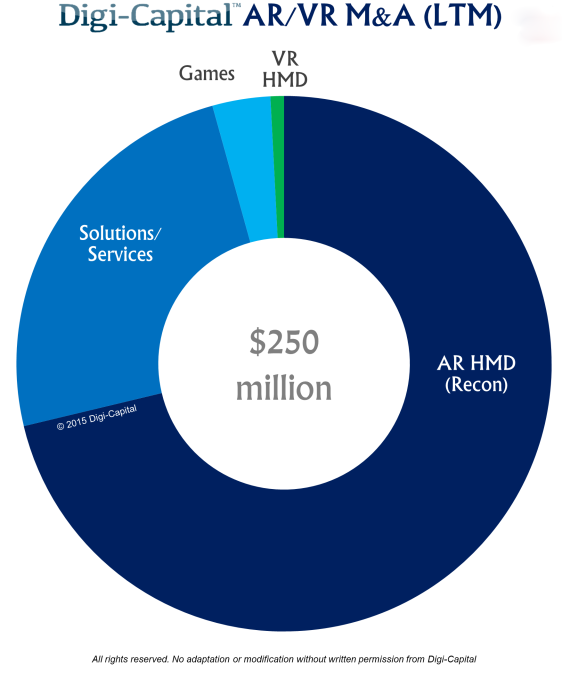 增強(qiáng)/虛擬現(xiàn)實(shí)市場(chǎng)在過(guò)去的12個(gè)月中產(chǎn)生了價(jià)值2.5億美元的并購(gòu)。明年可能發(fā)生巨大的變化,因?yàn)橹髁髌髽I(yè)將試圖通過(guò)購(gòu)買(mǎi)熱門(mén)初創(chuàng)公司來(lái)贏得競(jìng)爭(zhēng)。