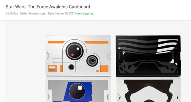 根據(jù)TechCrunch報(bào)道,谷歌在通過(guò)多種方式參與到《星球大戰(zhàn):原力覺(jué)醒》這條大船上。其中一種就是提供四款《星球大戰(zhàn)》定制版Google Cardboard頭顯,目前已經(jīng)登陸美國(guó)電信公司威瑞森(Verizon)的實(shí)體店。
