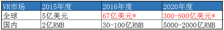 表中紅色部分是國外調研機構的數字,其中帶星的數字是Trendforce剛剛發(fā)布的調研結論,表明全球2016年VR軟硬件市場規(guī)??蛇_到67億美元,2020年可達到800億美元——另一家機構幾個月前給的同一時期數字是300億美元(AR市場1200億美元)。數字相差這么大的原因之一,在于VR技術可與大量傳統(tǒng)行業(yè)融合,所產生的價值和效益不好評估。