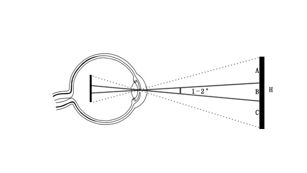 人眼成像的過程中,中央凹視野(Foveal vision area)成像清晰,只覆蓋視野1○~2○,視覺敏銳度高;周邊視野(Peripheral vision field)成像是模糊的。
