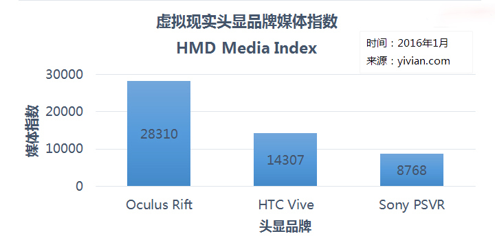 媒體在1月份的CES周首次發(fā)布了對(duì)三大虛擬現(xiàn)實(shí)頭顯Oculus Rift、HTC Vive以及索尼PSVR的媒體曝光率,并在當(dāng)初區(qū)分了企業(yè)品牌以及頭顯品牌。鑒于我們所采集的數(shù)據(jù)都是有關(guān)虛擬現(xiàn)實(shí)的新聞報(bào)道,而三個(gè)廠商的虛擬現(xiàn)實(shí)業(yè)務(wù)也都是圍繞各自的頭顯系統(tǒng)而展開,我們將不在區(qū)分企業(yè)與頭顯兩類,而統(tǒng)稱為頭顯品牌媒體指數(shù)。