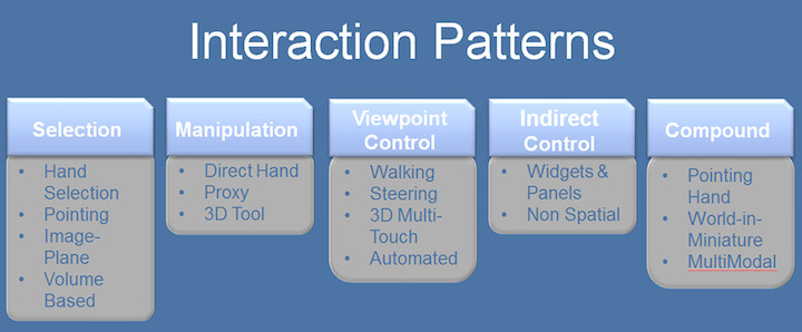 那么如果虛擬現(xiàn)實擁有無限可能,那我們該從何處著手設(shè)計高品質(zhì)的互動體驗?zāi)??其中一個方式就是我所說的交互模式和技術(shù)。交互模式是一種高層次的互動,可在不同應(yīng)用程序中重復(fù)使用,以達到普通用戶的要求。交互技術(shù)是交互模式的具體實施方法。相似的交互技術(shù)隸屬于同一個交互模式。