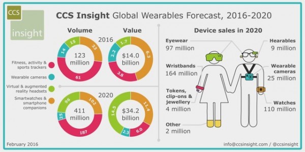 雖然如此,但是最大的業(yè)務(wù)仍是健身追蹤器、智能手表和智能手機(jī)伴侶。到2016年底將有6100萬(wàn)個(gè)活動(dòng)和健康追蹤器售出,CCS預(yù)測(cè)這一數(shù)據(jù)將會(huì)在2020年上升到1.87億個(gè)。