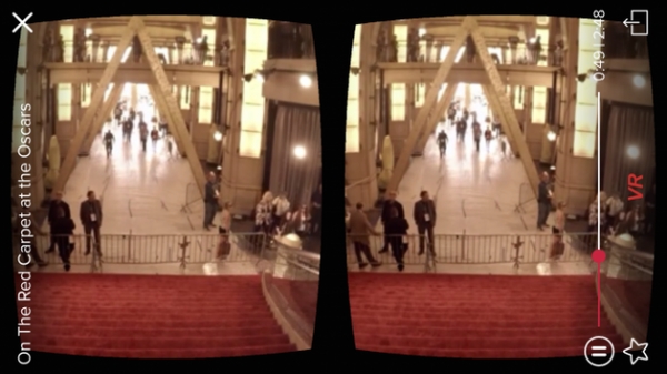 這段視頻初看起來(lái)很普通,但是只要按下視頻下方那個(gè)VR的按鈕,它就能瞬間變身VR視頻;再把手機(jī)放到Google Cardboard或者其他VR頭顯里,你就能夠真正身臨其境地來(lái)到紅毯上,感受紅毯上的星光熠熠。