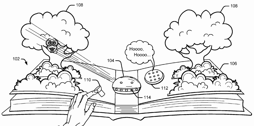 這兩項專利更值得一提的是,實體書的頁面中嵌入了動作和壓力傳感器。每翻一頁就會激活位于書脊上的投影儀并顯示畫面。這本書還設(shè)置了一個揚聲器搭配翻書和畫面顯示來播放語音。在目前看來這似乎有點荒唐且不切實際,因為成本投入過大,設(shè)備并不能按利潤出售。不過它還是會有一個非??岬募夹g(shù)demo。