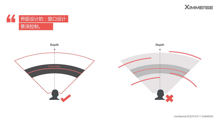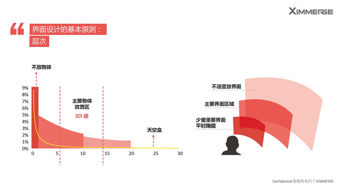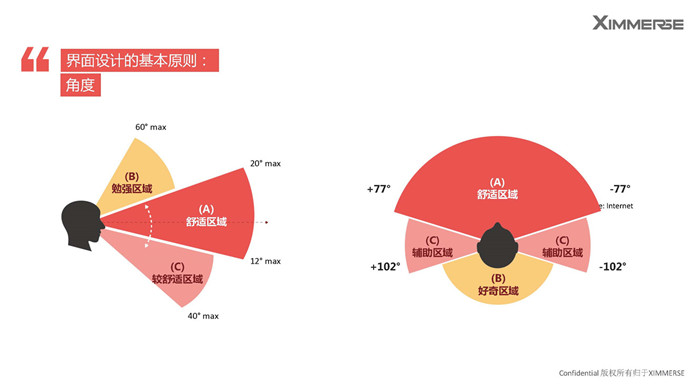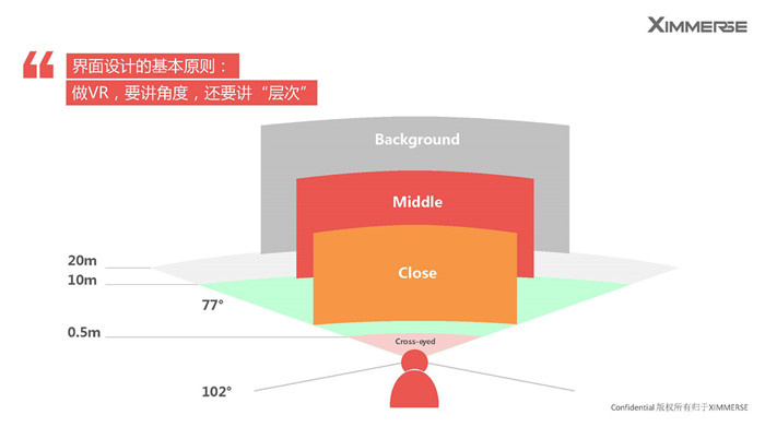 交互里的第二大點,是VR里面的界面,賀杰提到了界面設(shè)計的基本原則:做VR,要講角度,還要講“層次”。在界面設(shè)計時,我們希望用戶能第一時間去捕捉到信息,而且更好的掌握它,從正前方看,水平77°,上仰20°,俯瞰12°的范圍是最舒適的,同時也要有層次,最主要的物體最好是放置在0.5m范圍之外,0.5~10m的范圍是3D感最強(qiáng)的區(qū)間,20m之后可能就沒有3D感了。