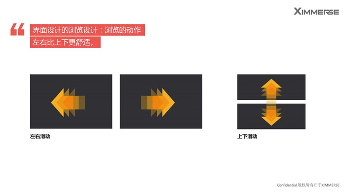 另外就是窗口設(shè)計,要注意以下范圍和景深控制,也要有易讀性,文字夠簡潔,有大圖標(biāo)。瀏覽設(shè)計上,要注意瀏覽的動作,左右比上下更舒適,最好是連續(xù)滾動,有連貫性。按鍵設(shè)計上,可視范圍大的情況下,要需要提升可辨識度,也要有明確的反饋,按鍵與相應(yīng)窗口的距離也是很重要的。