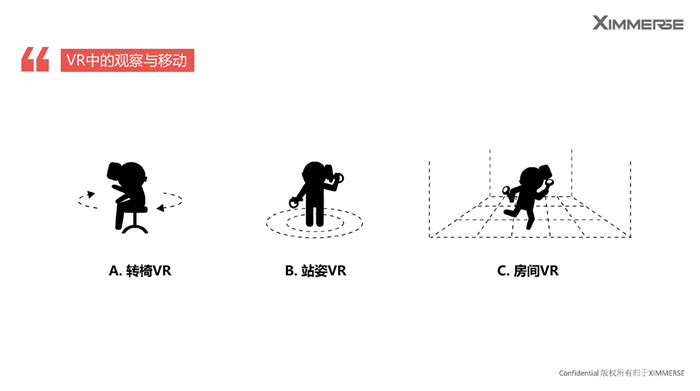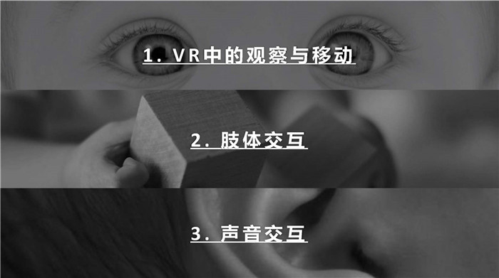 交互里的第三部分,是VR里面的互動?;诨?,賀杰把它分成了三大類:①VR中的觀察與移動②肢體交互③聲音交互。