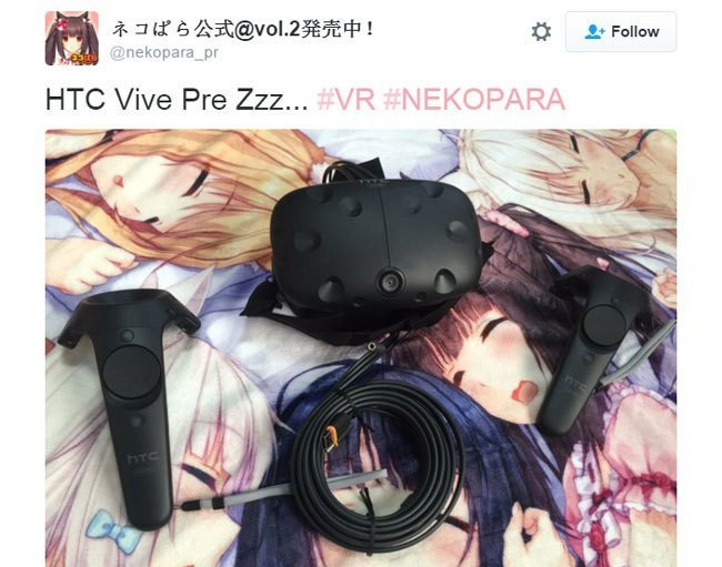 近日,戀愛養(yǎng)成游戲《Nekopara》的官方推特上分享了一張貓娘海報上擺放著虛擬現(xiàn)實頭顯 HTC Vive Pre 的照片,標題為“HTC Vive Pre Zzz…”。該照片一下引起了眾粉絲玩家的猜測,玩家們紛紛表示期待看到 VR 版的《Nekopara》。