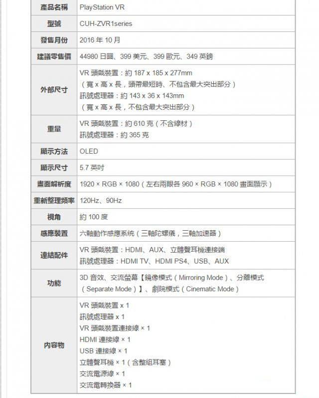 PS VR首發(fā)內(nèi)容包括PS VR頭戴裝置,訊號(hào)處理器,耳機(jī),但并不包括PS Camera和PS Move動(dòng)態(tài)手柄,二者單獨(dú)購(gòu)買分別是60美元和50美元。