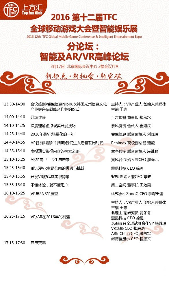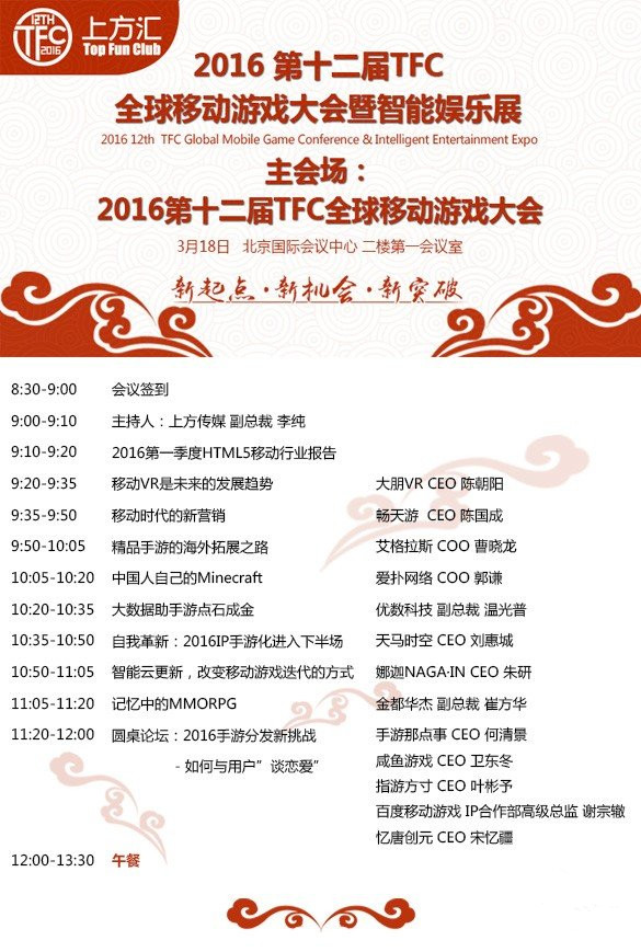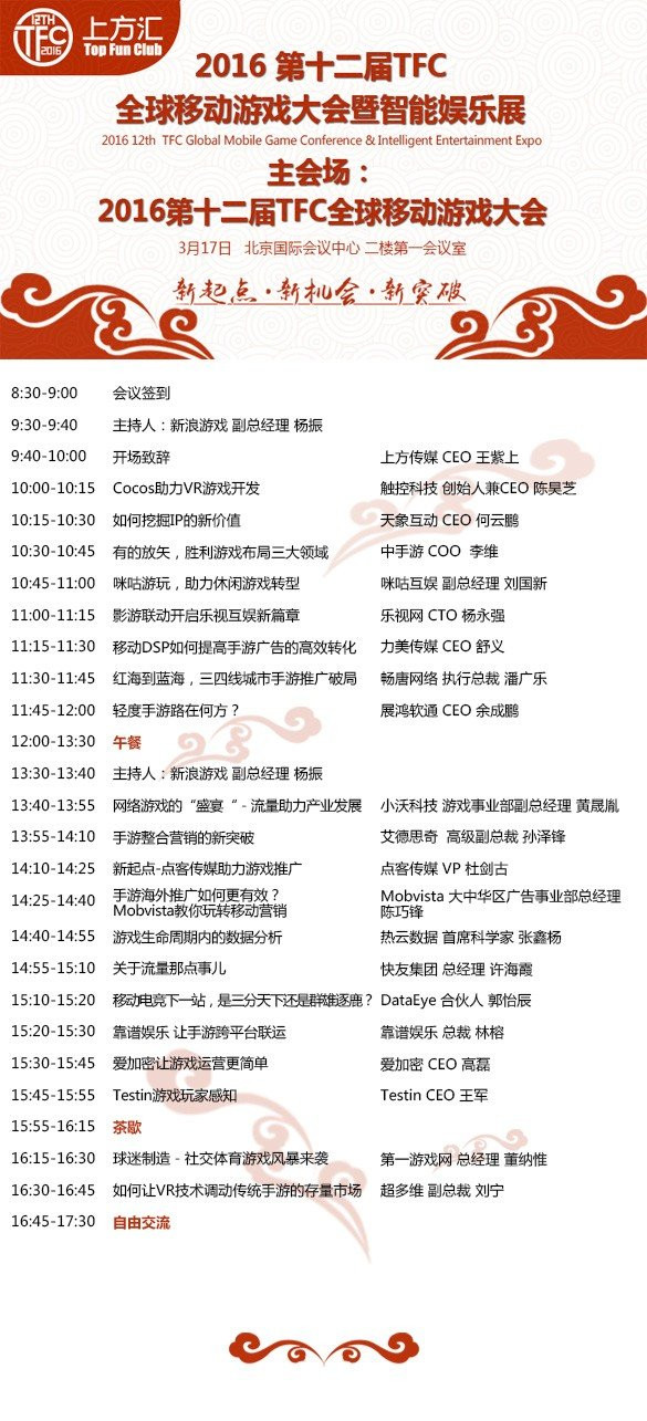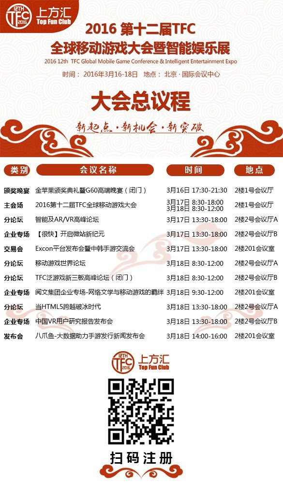 2016第十二屆TFC全球移動游戲大會暨智能娛樂展將于3月17-18日在北京國際會議中心正式拉開帷幕。本次大會作為國內(nèi)最具規(guī)模的B to B盛會,吸引了全國各地?zé)o數(shù)游戲及智能娛樂行業(yè)從業(yè)者,超過百名重量級嘉賓將登臺為大家?guī)硪粓鰣龈吆鹆康木恃葜v、論壇。首日TFC中,除了有主會場 的精彩主題演講,還在下午分別開設(shè)了3場精華主題論壇。下面小編將獻(xiàn)上本屆TFC首日精彩預(yù)告,相信各位已經(jīng)是摩拳擦掌整裝待發(fā)了。