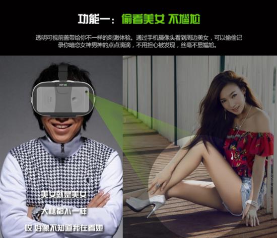 虛擬現(xiàn)實(shí)(Virtual Reality)簡(jiǎn)稱VR技術(shù),又稱“浸入式多媒體”(immersive multimedia)。“身臨其境”可能是淘寶賣家用來(lái)描述虛擬現(xiàn)實(shí)的一個(gè)高頻詞,這個(gè)詞被用作描述VR鏡的“旅游”功能。戴著VR鏡的情侶依偎在沙發(fā)上,卻被森林野獸所包圍,淘寶賣家認(rèn)為VR鏡可以“穿越時(shí)空”,圖片描述的超現(xiàn)實(shí)的場(chǎng)景向買家展示了一個(gè)“全新世界”。在這個(gè)新的世界里,買家可以擁有的是“VIP觀賞角度”,現(xiàn)實(shí)中無(wú)法獲得的視角在VR鏡中的世界里得以實(shí)現(xiàn)。