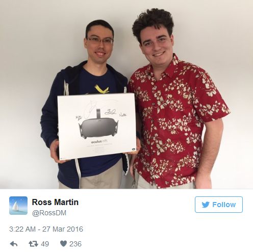 在 美國時間3月28日,售價599美元的Oculus Rift消費者版將會正式出貨。在這之前,Oculus的創(chuàng)始人Palmer Luckey已經(jīng)迫不及待了。據(jù)報道,Luckey近日為首個預(yù)訂者送上Rift消費者版套裝。然而,稍微有些諷刺的是,這位預(yù)定者所在的辦公室沒有電腦 能夠支持Rift。所以,當(dāng)Luckey把這套設(shè)備送到他面前的時候,他們只能拿著Rift拍照(上圖)而不能第一時間進行體驗,呵呵~