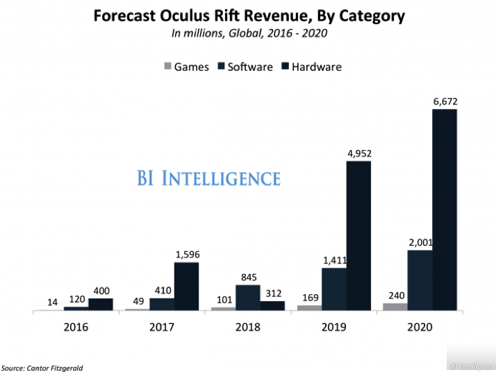 通過Cantor Fitzgerald 的預(yù)測,我們更清楚Facebook大概會在什么時候發(fā)行第二代Rift。在2018年,預(yù)測該公司硬件收入只能達到3億1200萬美元,主要是要靠軟件和游戲的銷售。2019年起,硬件收入預(yù)計50億左右。如果每臺頭顯售價為499美元,那大概要賣出1000萬臺頭顯,預(yù)示著該公司將在2019年推出新一代頭顯。BI Intelligence圖表顯示,硬件收入在2020年將持續(xù)增長,預(yù)計收入為66億美元。也就意味著,2020年全年,要賣出1300萬臺設(shè)備。